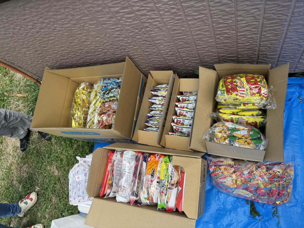 午前中は、祭壇や幣束を棟梁に作っていだたき、我々夫婦と両親が参列しお清を行った。祭壇の周りにはいくつも駄菓子の箱を置いてお供えとした。両親や兄からも駄菓子の差し入れがあり、かなり充実した品ぞろえとなった。